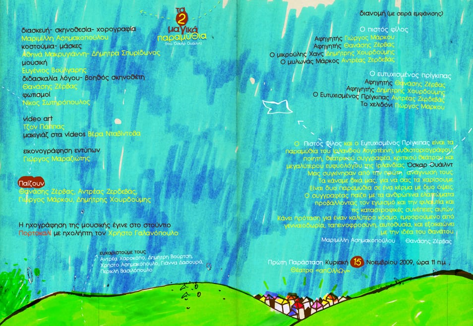 Στη σκηνή ξετυλίγεται με μαγικό τρόπο το κουβάρι των παραμυθιών του μεγάλου δημιουργού που θα γοητεύσει μικρούς και μεγάλους. Δύο παραμύθια με δύο όψεις του Όσκαρ Ουάιλντ, που παίζει με τα ανθρώπινα ελαττώματα και τις καταστροφικές τους συνέπειες, αλλά και με τα προτερήματα όπως η γενναιοδωρία, η ταπεινοφροσύνη που οδηγούν τον άνθρωπο σένα καλύτερο κόσμο.