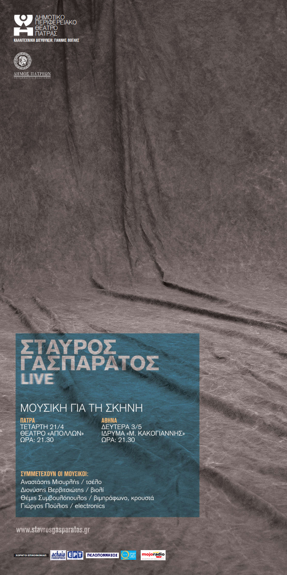 Ο Σταύρος Γασπαράτος παρουσιάζει σε συνεργασία με την Αντιδημαρχία Πολιτισμού και το ΔΗ.ΠΕ.ΘΕ Πάτρας, μια συναυλία σε δύο μέρη. Στο πρώτο μέρος θα παρουσιαστεί ζωντανά υλικό από το άλμπουμ «Rehearsals» (επιλογή από συνθέσεις για θέατρο και χορό), και στο δεύτερο μια σειρά νέων ακυκλοφόρητων συνθέσεων του Σταύρου Γασπαράτου που θα παρουσιαστούν για πρώτη φορά σε αυτή την σειρά συναυλιών.