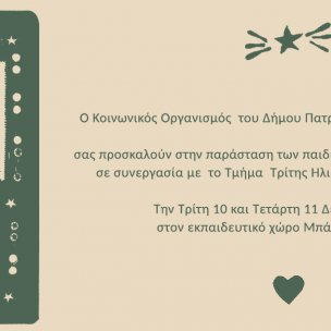 Τα παιδιά του ΚΔΑΠ ΜΕΑ ΚΟΜΑΙΘΩ και αυτή τη χρονιά ετοιμάζονται για την χριστουγεννιάτικη γιορτή τους. Συνεργάζονται με το Τμήμα Τρίτης Ηλικίας του Δήμου Πατρέων και το ΔΗ.ΠΕ.ΘΕ. Πάτρας και παρουσιάζουν την παράσταση: