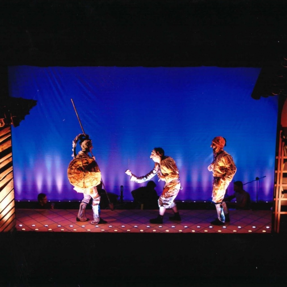 Πρόκειται για μία διασκευή του κλασικού έργου του θεάτρου σκιών σε μία παράσταση με πέντε ηθοποιούς και τριμελή ορχήστρα.