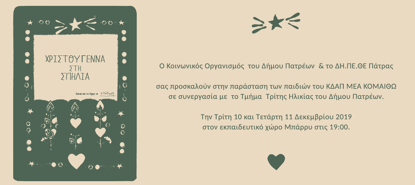 Τα παιδιά του ΚΔΑΠ ΜΕΑ ΚΟΜΑΙΘΩ και αυτή τη χρονιά ετοιμάζονται για την χριστουγεννιάτικη γιορτή τους. Συνεργάζονται με το Τμήμα Τρίτης Ηλικίας του Δήμου Πατρέων και το ΔΗ.ΠΕ.ΘΕ. Πάτρας και παρουσιάζουν την παράσταση: